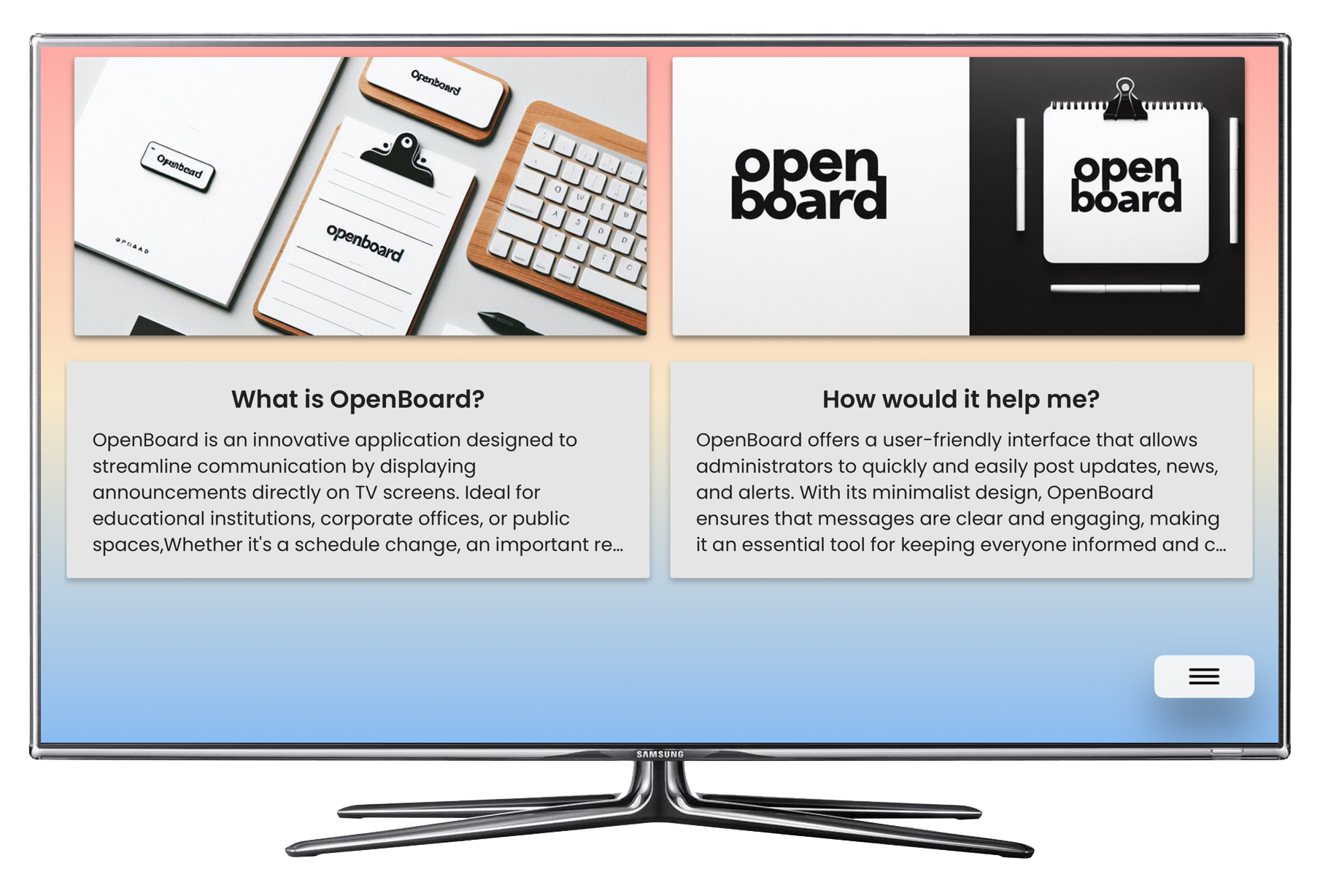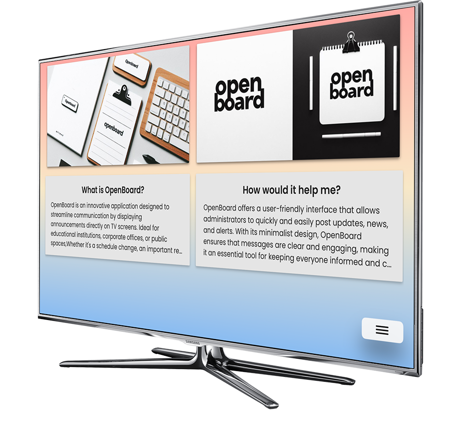 OpenBoard makes it easy to put announcements on TV screens, making sure important info gets seen. It's simple to use and has cool features that grab people's attention, making old-fashioned bulletin boards a thing of the past. Switch to OpenBoard for better communication that gets noticed.